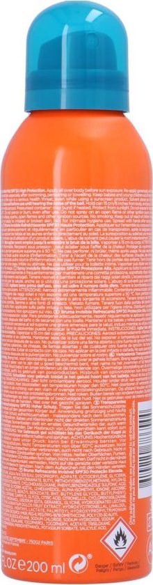 Sun Sport Cooling Invisible Mist SPF 30 van Lancaster is een alcoholvrije olievrije water en transpiratiebestendige SPF 30 Cooling Mist Het zorgt voor een droge finish en voorkomt dat zout en zandkorrels aan de huid blijven plakken De spray voelt onmiddellijk droog aan zonder dat het een vettige laag of een plakkerig gevoel achterlaat De huid wordt beschermd en gehydrateerd