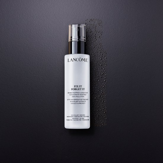 Deze fixerende spray van Lancôme vernauwt de poriën. De spray bevat een kiwi-extract dat beschermt tegen vervuiling. Het product beschikt tevens over een hoge concentratie vitamine C en hamamelis om de poriën te vernauwen. Ook bevat het Moringa oleifera, wat snel in de huid dringt en het indringen van vervuilende deeltjes voorkomt. Naast dit effect geeft het de huid een ultiem gevoel van lichtheid en frisheid, en maakt het dat de make-up 24 uur lang onberispelijk blijft.-Lancôme Fix It Forget It Fixing spray 100 ml