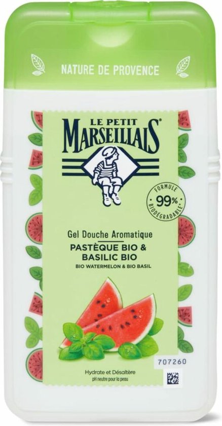 Le Petit Marseillais Douchegel BIO Watermeloen & BIO Basilicum <p> De Aromatische Douchegel Le Petit Marseillais® Bio Watermeloen en Bio Basilicum is een veganistische douchegel waarvan de 99% biologisch afbreekbare formule een natuurlijke moisturizer bevat om je huid te hydrateren en te verkwikken. </p> <ul> <li>Veganistische formule verrijkt met een hydraterend bestanddeel op plantaardige basis</li> <li>pH-huidneutraal</li> <li>Getest onder dermatologisch toezicht</li> <li>De ingrediënten van de reinigende basis zijn makkelijk bioafbreekbaar</li> <li>100% recyclebare fles</li> </ul>
