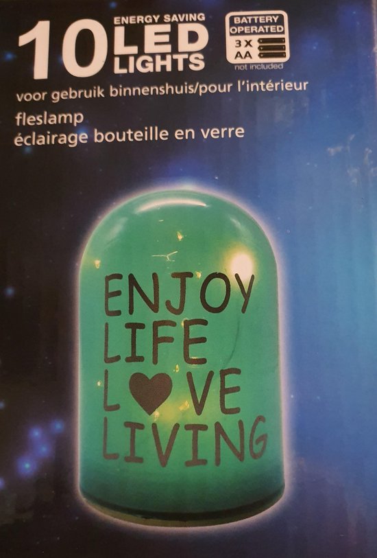 1 x Led-Licht – Fleslamp – 12 x 8 cm – Groen. Gaat op 3 x AA-batterijen. Gaat zeer lang mee met leuke tekst: Enjoy Life Love living