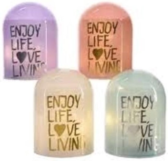 1 x Led-Licht – Fleslamp – 12 x 8 cm – Rood. Gaat op 3 x AA-batterijen. Gaat zeer lang mee met leuke tekst: Enjoy Life Love living