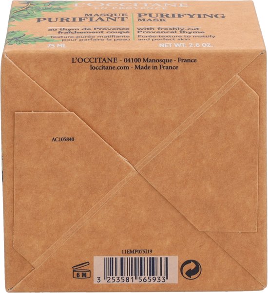 Een masker van yoghurt structuur verrijkt met tijm uit de Provence om uw huid te zuiveren en overtollig talg te verminderen Voor de normale tot vettigere huid Na het eerste gebruik ziet de huid er egaal uit gezuiverd en glad U huid heeft weer een vlekkeloze teint Gebruik Breng een dunne laag aan op het hele gezicht vermijd de oogcontour Laat 5 minuten inwerken en spoel af