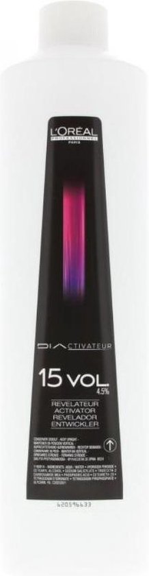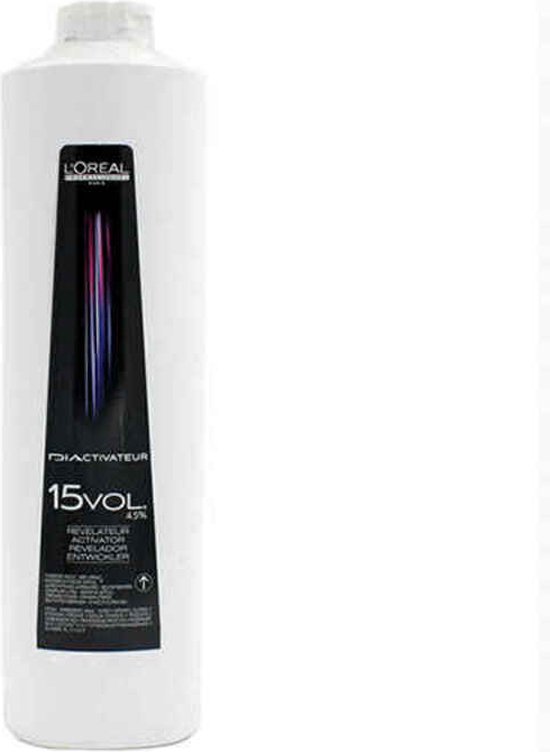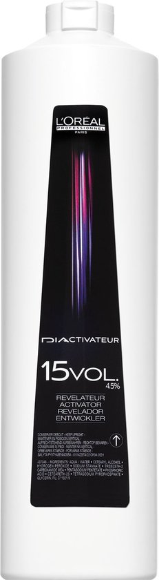 L’Oréal Dia Activateur 15 VOL 4.5% 1000ml L’Oreal Dia Activateur 4.5% (vol 15) is een waterstofperoxide voor L’Oreal Dia Richesse en L’Oreal Dia Light kleuringen. De ontwikkelaar zorgt voor een soepel, romig mengsel zodat het haar optimaal kan kleuren. Deze L’Oréal ontwikkelaar heeft een percentage van 4.5% of ook genoemd 15 VOL. en is specifiek gemaakt om optimaal te werken met alle L’Oréal haarverf. De formule is verrijkt met essentiële ingrediënten zoals polymeren, die de haarvezel voeden en verzorgen. Deze waterstofperoxide wordt gemengd met de semi-permanente haarkleuringen van L’Oreal. L’Oreal Dia Activateur verankert de kleur in het haar tijdens het kleuringsproces en verzorgt het tegelijkertijd. Verder is deze ontwikkelaar verkrijgbaar in 2 andere soorten.