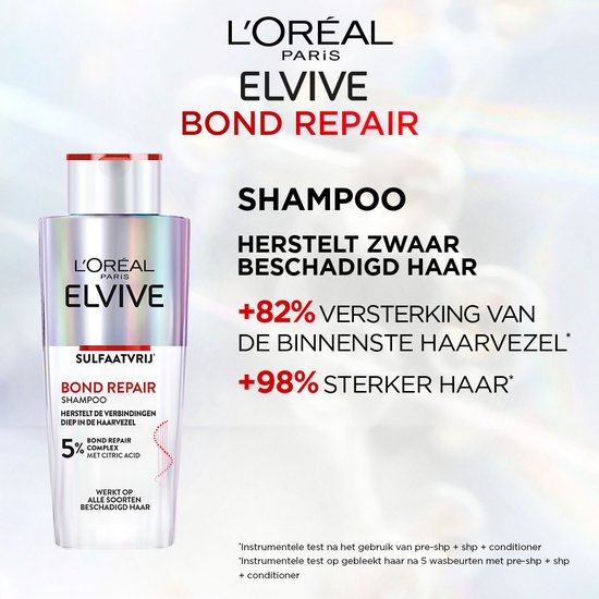 Is jouw haar beschadigd door kleuren, bleken, de hitte van stylingtools of UV-straling? Onze nieuwste innovatie herstelt jouw haar terug naar de originele haarsterkte. De Bond Repair sulfaatvrije shampoo van L’Oréal Paris Elvive reinigt en versterkt het haar. Met een romige crèmestructuur is de shampoo speciaal ontwikkeld om het haar zacht te reinigen en de haarvezel te versterken. Zo zorgt L’Oréal Paris Elvive Bond Repair voor: