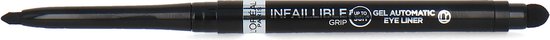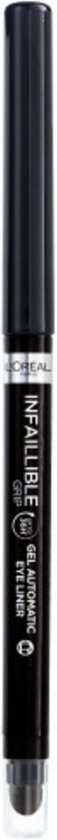 ProductbeschrijvingDe L’Oréal Paris Infaillible 36H Grip Gel Automatic Eyeliner is een opdraaibaar oogpotlood die tot 36 uur blijven zitten.* De kleur loopt niet uit, vervaagt niet en is waterproof.*Consumententest, 100 vrouwen. Productomschrijving:De L’Oréal Paris Infaillible 36H Grip Gel Eyeliner is een opdraaibaar gelpotlood met een handige sponsapplicator. Dankzij de romige textuur die gemakkelijk over de huid glijdt kun je het uitschuifbare potlood comfortabel en precies aanbrengen. De speciale gelformule blijft de hele dag goed zitten. De kleur loopt niet uit, vervaagt niet en is waterproof. Met de handige ingebouwde sponsapplicator creëer je gemakkelijk een smokey eye look. Het potlood kan geslepen worden met de ingebouwde puntenslijper die aan de achterkant van de sponsapplicator vastzit. Bulletpoints:• Opdraaibaar gelpotlood• Waterproof & vlekbestendig • Voor groter lijkende ogen• Tot 36 uur lanhoudend* consumententest, 100 vrouwen• Geschikt voor gevoelige ogen en dragers van contactlenzen GebruiksaanwijzingStap 1: Breng het oogpotlood aan door een lijn te trekken boven de wimperaanzet waarbij je de eyeliner vanuit de binnenkant van het oog naar de buitenkant laat glijden. Stap 2: Voor een extra intense look blend met de sponsapplicator IngrediëntenDimethicone • Trimethylsiloxysilicate • Polyethylene • Acrylates/Stearyl Acrylate/Dimethicone Methacrylate Copolymer • Synthetic Fluorphlogopite • Silica • Ozokerite • Cellulose • Polyisobutene • Alumina • Kaolin • Disteardimonium Hectorite • Pentaerythrityl Tetra-Di-T-Butyl Hydroxyhydrocinnamate • Tin Oxide • Propylene Carbonate • Polyglyceryl-3 Polydimethylsiloxyethyl Dimethicone • Maltodextrin “Houd er rekening mee dat de ingrediëntenlijsten voor producten van ons merk regelmatig worden bijgewerkt. Raadpleeg de ingrediëntenlijst op de productverpakking voor de meest actuele lijst met ingrediënten om er zeker van te zijn dat deze geschikt is voor uw persoonlijk gebruik. ” (Voor producten die in de winkel worden bijgevuld, moet de meest actuele ingrediëntenlijst worden verkregen op het verkooppunt nadat het product opnieuw is gevuld).