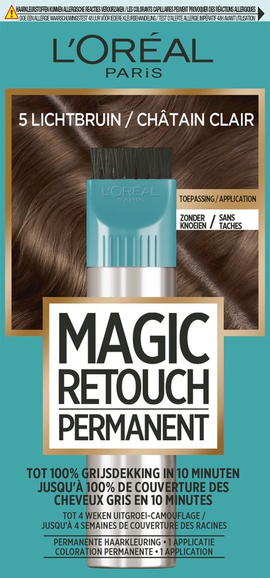 <b>Magic Retouch Permanent 5 Lichtbruin</b> <p>L’Oréal Paris Magic Retouch Permanent biedt een snelle oplossing tussen haarkleuringen – binnen 10 minuten kan deze permanente haarkleuring tot 100% van je grijze haren dekken. Eenmaal gedekt, blijft je uitgroei tot 4 weken gecamoufleerd. Het kleurmengsel maak je eenvoudig zelf met behulp van de componenten die je in de verpakking vindt. Het gaat hierbij om een kleurgel, een ontwikkelcrème, een zachte borstel, een nauwkeurige applicatiepunt en een paar handschoenen. De kleine flacon kleurgel giet je in de aanbrengflacon waar de ontwikkelcrème al in zit. Schud de aanbrengflacon vervolgens goed, om een egaal kleurmengsel te verkrijgen. Voordat je begint met aanbrengen kun je kiezen tussen twee verschillende applicatie opzetstukken: de Zachte Borstel of de Nauwkeurige Applicatiepunt. De Zachte Borstel is bedoeld voor gemakkelijke verdeling over de uitgroei en de Nauwkeurige Applicatiepunt juist voor nauwkeurige applicatie op de uitgroei. Deze twee opzetstukken zijn allebei ontwikkeld om de haarkleuring makkelijker met jouw haar te laten mengen zonder te knoeien. Heb je je opzetstuk gekozen? Dan kun je direct aan de slag gaan met de applicatie! Na het kleuren kun je genieten van een natuurlijk kleurresultaat. De haarkleuring mengt met jouw huidige haarkleur waardoor de kleur goed aansluit en natuurlijk oogt.</p> Tot 100% grijsdekking in 10 minuten Tot 4 weken uitgroei camouflage Makkelijk en zonder te knoeien aan te brengen <p>Let op: Doe een allergie waarschuwingstest 48 uur vóór iedere haarkleurbehandeling. Ook indien je al eerder je haar gekleurd hebt. In de gebruiksaanwijzing in de verpakking staat beschreven hoe je dit doet. Volg tijdens het kleuren altijd de gebruiksaanwijzing nauwkeurig op.</p>