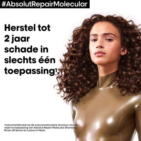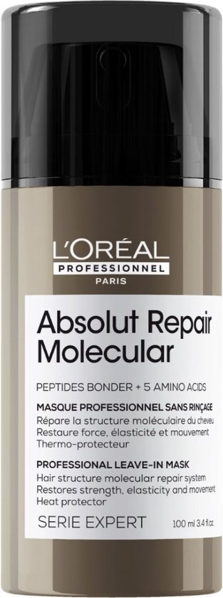 L’Oréal Professionnel Absolut Repair Molecular Leave-in Mask is een professioneel leave-in masker, geformuleerd met Peptiden bonder + 5 aminozuren om de macromoleculaire structuur van het haar te herstellen.