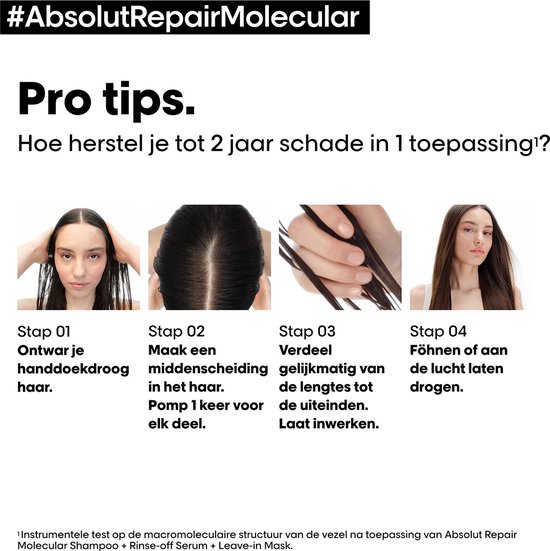 Voor optimale resultaten na Absolut Repair Molecular shampoo & uit te spoelen serum gebruiken. Aanbrengen op handdoekdroog haar. Verdeel het haar in twee verdelingen en breng één pompje per verdeling aan. Breng indien nodig meer aan. Ontwar voor optimale verdeling. Zonder uitspoelen. Ga verder met föhnen of laat aan de lucht drogen.