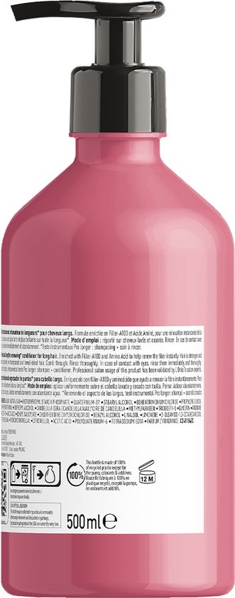 De L’Oréal Professionnel – Pro Longer – Serie Expert – Conditioner 500 ML is een professionele conditioner die speciaal is ontwikkeld om lang haar te verzorgen en te versterken. Deze conditioner is verrijkt met de unieke Filler-A100-technologie, die de lengtes van het haar opvult en versterkt, waardoor het haar er voller en gezonder uitziet. Daarnaast bevat de conditioner aminozuren, die het haar voeden en hydrateren, waardoor het zacht en glanzend wordt. De formule is lichtgewicht en niet-vettig, waardoor het haar niet verzwaard wordt. Na gebruik voelt het haar zijdezacht aan en is het makkelijk doorkambaar.