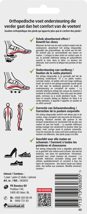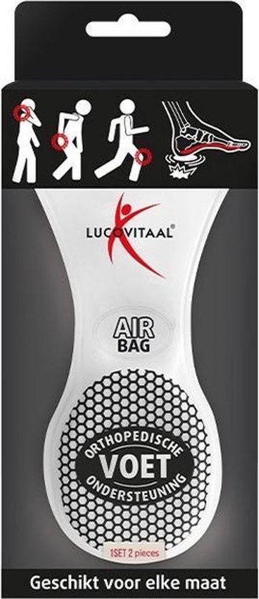 De Orthopedische Voet Ondersteuning (Airbags) van Lucovitaal is geschikt voor iedere soort schoen en alle maten. De Orthopedische Voet Ondersteuning (Airbags) van Lucovitaal gaat verder dan het comfort aan de voeten. De airbag is zo gemaakt dat het de voetboog ondersteunt, ook bij platte voeten en voeten met een hoge voetboog. De airbag verlicht pijn en corrigeert de lichaamshouding.