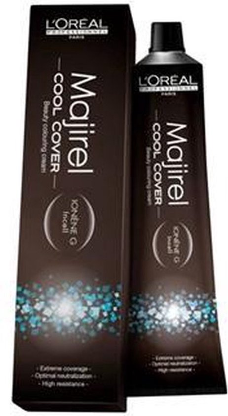 L Oreal Professionnel Majirel Cool Cover Deze permanente haarverf is gemaakt voor de mooiste diepste kleureffecten die niet vervagen Trendy moderne koele maar toch ook neutrale kleuren geven het haar een glanzende look De kleur dringt diep door waardoor deze langer behouden blijft Is geschikt voor elk haartype en geeft een 100 dekking Door de Ionene G Incell Technologie wordt het haar niet beschadigt