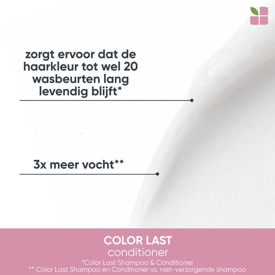 Color treated hair often loses it s color and luster over time Biolage COLORLAST Conditioner helps maintain color depth tone and shine for vivid color treated hair Give her hair salon vibrant color for up to 9 weeks nn When using the system of COLORLAST Shampoo and Conditioner vs a non conditioning shampoo nnHOW TO USEnApply to wet hair and leave in 1 3 minutes Rinse thoroughly We recommend that you pair the COLORLAST Conditioner with COLORLAST Shampoo to help maintain your color treated hair nn Low pH Conditioner nourishes hair to help extend the life of your color radiance ln Hair is left feeling soft and detangled with extra shine and depth of color radiancen Paraben free formula is formulated specifically for color treated hair