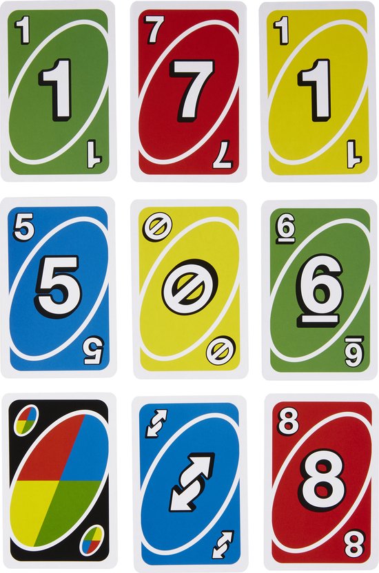 In totaal zitten er 108 verschillende kaarten in het spel UNO. Er zijn kaarten met daarop de cijfers 0 tot 9.