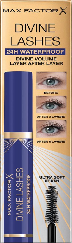 Max Factor Divine Lashes mascara waterproof black is dé mascara die je oogverblindende lange en volumineuze wimpers geeft die goddelijk zacht aanvoelen. De formule voelt ultra licht aan op je wimpers en breng je laag voor laag aan om een onweerstaanbaar dramatisch en volumineus wimpereffect te creëren. De Max Factor Divine Lashes Mascara is verrijkt met panthenol, deze pro-vitamine B5 zorgt voor soepele en zachte wimpers. Dit maakt de Divine Lashes Mascara ook geschikt voor contactlensdragers. De rijke romige formule brengt veegvast en gelijkmatig aan. Het definieert de wimpers vanaf de aanzet tot aan de top zonder te klonteren. De fijne borstelapplicator ligt prettig in de hand, is extreem zacht en brengt de mascara vlokvrij aan. Het verdeelt de mascara met precisie, iedere wimper wordt gedekt voor een ultra natuurlijk volumineuze finish.