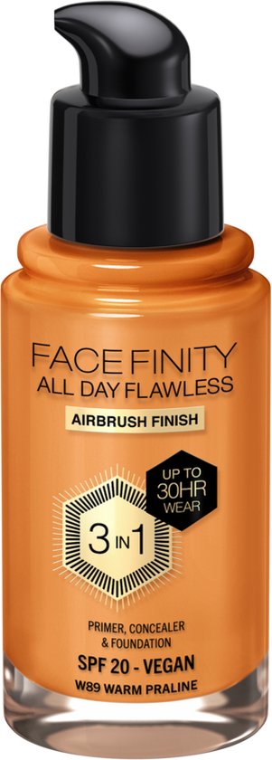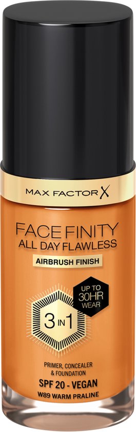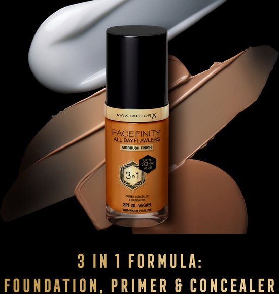 Max Factor Facefinity All Day Flawless Foundation staat garant voor een feilloze make-uplook en is nu bestand tegen alle weersomstandigheden. Deze 3-in-1 vloeibare foundation doet tegelijk ook dienst als gezichtsprimer en heeft het effect van een concealer die de hele dag mooi blijft zitten. De vederlichte, zuurstofdoorlatende vegan formule maakt poriën en roodheid minder zichtbaar en camoufleert oneffenheden. Niet alleen zorgt de formule voor een perfect egale finish, maar deze foundation is ook bestand tegen de weersomstandigheden en verrijkt met SPF20 om de huid te beschermen tegen uv A- en uv B-stralen, blauw licht en vervuiling.