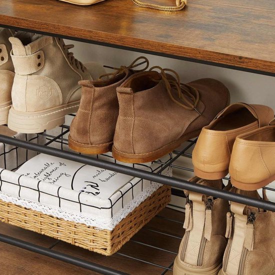 Deze staande kapstok biedt niet alleen voldoende ruimte om je jassen en tassen op te hangen, maar ook om je schoenen netjes op te bergen. Het schoenenopbergsysteem is voorzien van twee rekken waarop je gemakkelijk jouw schoenen kwijt kunt. Dankzij het slimme ontwerp bespaar je veel ruimte in je entree, terwijl je toch alles bij de hand hebt wat je nodig hebt.