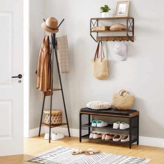 Maxenza Home LBS75X Schoenenbank met Zitje – Industrieel Schoenenrek Zwart – Hout en Metaal – Multifunctioneel Schoenenrekje