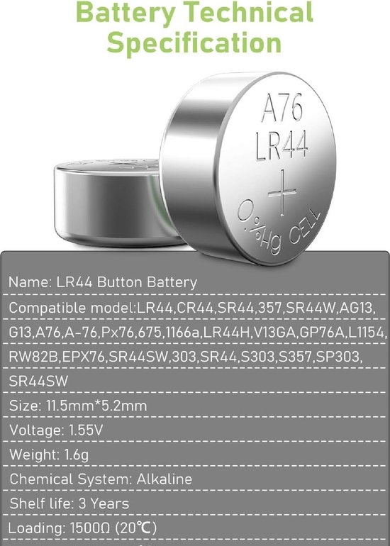 Op zoek naar betrouwbare LR44, AG13 of A76 knoopcel batterijen? Stop met zoeken! De Maxenza V13GA batterijen zijn precies wat je nodig hebt. Met een voltage van 1.5V en een verpakking van 50 stuks, ben je verzekerd van genoeg energie voor al jouw apparaten. Bestel vandaag nog en geniet van langdurige prestaties! Voordelen: – Met deze Maxenza LR44 batterijen ben jij altijd voorzien van genoeg energie! – AG13 batterijen van topkwaliteit voor al jouw elektronische apparaten. – A76 knoopcel batterijen die lang meegaan en betrouwbaar zijn in gebruik. – 1.5V V13GA batterijen die perfect passen en zorgen voor optimale prestaties. – Met deze set van 50 batterijen heb jij altijd genoeg reserve op voorraad. Langdurig gebruik: Met deze set van 50 LR44 batterijen van Maxenza hoef je voorlopig niet om te kijken naar nieuwe batterijen. Compatibiliteit gegarandeerd: Deze AG13 en A76 knoopcel batterijen zijn perfect voor horloges, calculators en speelgoed. Uitstekende kwaliteit: Met een voltage van 1.5V V13GA zorgen deze batterijen voor langdurige en betrouwbare prestaties. Specificaties – 50 Maxenza LR44 batterijen – AG13 / A76 knoopcel batterijen – 1.5V V13GA – Geschikt voor diverse elektronische apparaten – Hoogwaardige kwaliteit – Lange levensduur – Handig om in huis te hebben – Ideaal voor gebruik in afstandsbedieningen, speelgoed en horloges Veelgestelde vragen: Kan ik deze LR44 batterijen gebruiken voor mijn horloge? Ja, deze LR44 batterijen zijn geschikt voor gebruik in horloges, rekenmachines, speelgoed en andere elektronische apparaten die dit type batterij vereisen. Zijn deze AG13 batterijen ook geschikt voor gebruik in afstandsbedieningen? Ja, deze AG13 batterijen kunnen ook gebruikt worden in afstandsbedieningen van bijvoorbeeld televisies, dvd-spelers en andere elektronische apparaten. Hoe lang gaan deze A76 knoopcel batterijen mee? De levensduur van deze A76 knoopcel batterijen kan variëren afhankelijk van het gebruik en de omstandigheden, maar over het algemeen gaan ze lang mee en bieden ze een constante en betrouwbare stroomvoorziening. Zijn deze V13GA batterijen compatibel met andere merken? Ja, deze V13GA batterijen van het merk Maxenza zijn compatibel met andere merken die hetzelfde type batterij gebruiken, dus je kunt ze zonder problemen gebruiken als vervanging voor je huidige batterijen. Hoeveel batterijen zitten er in deze verpakking? Deze verpakking bevat in totaal 50 stuks LR44 batterijen, AG13 batterijen, A76 knoopcel batterijen en V13GA batterijen, zodat je altijd voldoende batterijen bij de hand hebt voor al je elektronische apparaten.