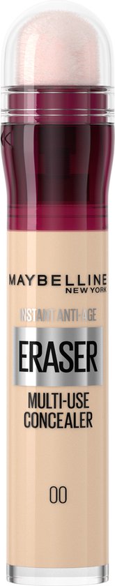 De Maybelline Instant Anti Age Eraser, eerst bekend als Instant Age Rewind concealer, is de Maybelline concealer waar elke beautylover bij zweert. Met de zeer dekkende concealer is het gemakkelijk om donkere kringen en wallen zichtbaar weg te werken. Verschillende fans zien deze concealer met spons als de beste concealer van Maybelline* door de super gemakkelijke applicatie. Jouw vertrouwende Instant Age Rewind concealer, verbeterd en nog steeds ultra gemakkelijk. Aan te brengen in een New York minute. Met een super-creamy textuur is deze Instant Anti Age Eraser 00 Ivory concealer zacht voor de huid, en door de pigmentatie zeer dekkend. Door de unieke formule van de Maybelline concealer trekt de liquid concealer niet in de lijnen van de huid voor een egaal en glad resultaat. De formule bevat Goji bes extract, wat de huid rondom de ogen hydrateert en daarmee fijne lijntjes tegengaat. Ook bevat het Haloxyl, wat donkere kringen onder de ogen neutraliseert. De gehele range Instant Anti Age Eraser concealers heeft meer kleuren dan ooit zodat je de kleur kunt vinden die bij jouw huid past.