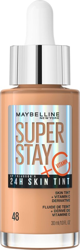 Jouw huid glow-up met Superstay 24H Skin Tint! Deze foundation van Maybelline New York geeft een stralende, skin-like finish. De formule verrijkt met vitamine C* houdt tot 24 uur** en biedt opbouwbare dekking. De lichte textuur van de vloeibare foundation egaliseert de teint en zorgt voor een frisse, natuurlijke look. Superstay 24H Skin Tint is verkrijgbaar in 20 tinten, geschikt voor alle huidtinten en -types. De lichte, geteste formule laat de huid ademen. Gebruik 1 tot 2 druppels voor een lichte dekking en voeg meer druppels toe voor een medium dekking. Vanuit het midden van het gezicht naar buiten toe uitsmeren met de vingers, een kwastje of een sponsje.*Vitamine C-derivaat **Consumententest, 110 personen
