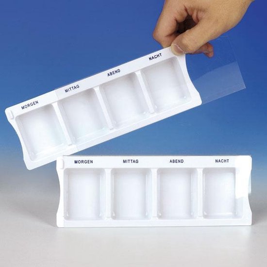 In deze medicijncassette kunnen de medicijnen voor één dag opgeborgen worden. De cassette bevat vier separate vakjes met een verdeling in ochtend, middag, avond en bedtijd. Zo kunnen de medicijnen gescheiden van elkaar worden bewaard en is de medicatie per dag overzichtelijk.
