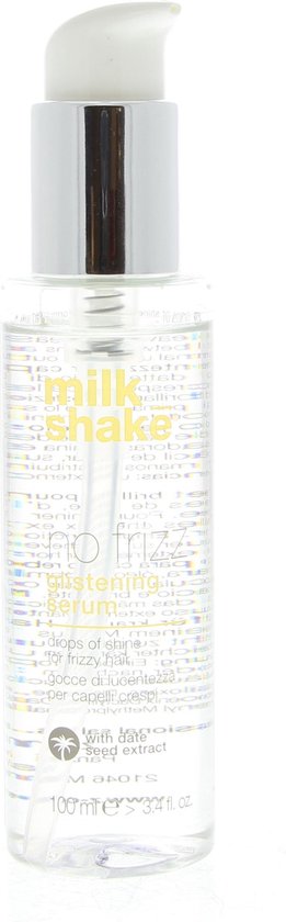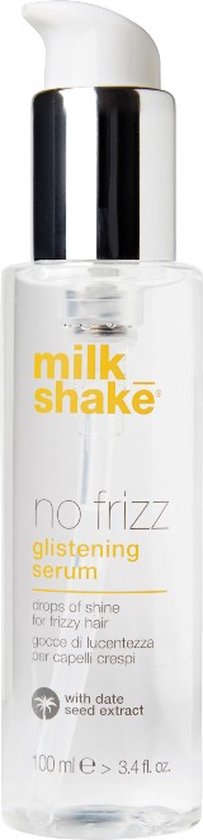 Milk_Shake No Frizz Glistening Serum. Beschermende glans druppels, met dadelzaadolie-extract en abyssianian olie. Het haar blijft handelbaar, beschermt tegen hitte en voorkomt pluizig haar tijdens en na de stylling. Gebruik: Een paar druppels verdelen over de haren, voor of na het stylen.