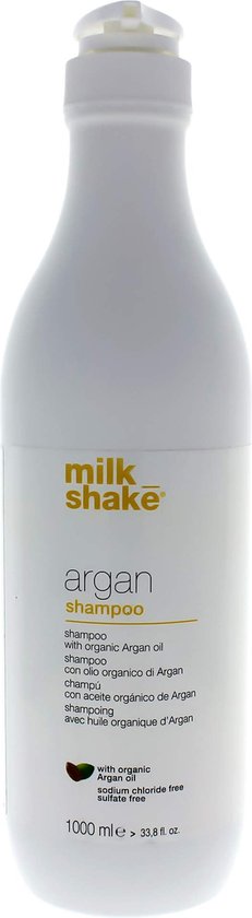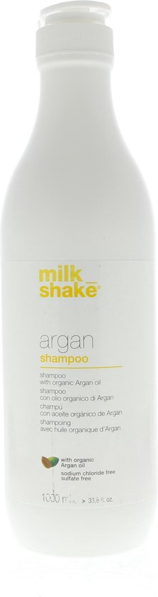 Milk_Shake Argan Shampoo. Reinigende zachte shampoo die het haar voedt en hydrateert, door de toevoeging van organische argan olie. Het haar wordt zacht en vermindert pluizige haren, beschadigde haren worden beschermd en versterkt, en het zorgt voor kleurbehoud. Bevat zijde rijst en soja-eiwitten, en actieve ingrediënten zonder sulfaten en natriumchloride. Gebruik: Inmasseren op nat haar, daarna zorgvuldig uitspoelen.