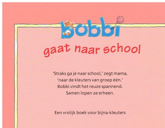 Monica Maas & Geen Leesboek – Bobbie gaat naar School Samenvatting: Voor het eerst naar de basisschool: een belangrijk moment in het leven van ieder kind en iedere ouder! Dit nieuwe boekje over Bobbi is een leuke voorbereiding op die spannende eerste school¬dag en geeft alvast een kijkje in de kleuterklas. `Straks ga je naar school,’ zegt mama, `naar de kleuters van groep één.’ Bobbi vindt het reuze spannend. Samen lopen ze erheen. Mama wijst: ‘Hier mag je beker en hang daar je jas en tas.’ Jufzegt: ‘Goedemorgen Bobbi, welkom in de kleuterklas!’
