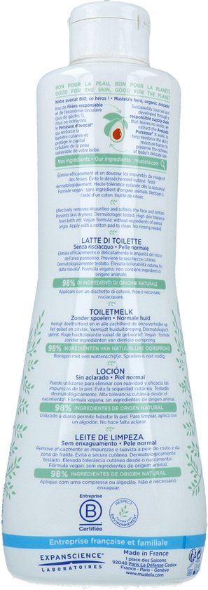 Mustela BA c bA c Lait de Toilette Toiletmelk Specifiek geformuleerd voor een gebruik vanaf de geboorte is de Toiletmelk ideaal voor de toiletverzorging van uw baby De huid van het gezicht en het zitvlak is perfect gereinigd in alle zachtheid en zonder uitdroging De huid is gehydrateerd en de hydrolipidische film wordt behouden dankzij een complex van plantaardige oliA