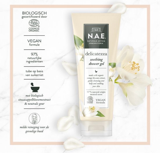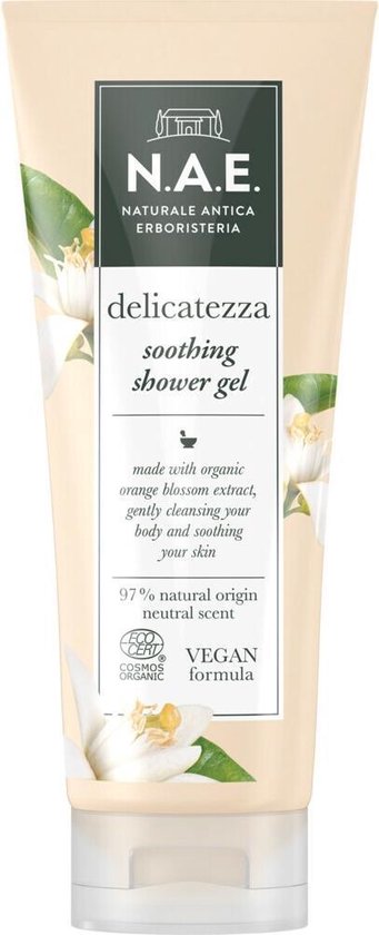 N.A.E. Delicatezza douchegel bestaat voor 97% uit natuurlijke ingrediënten en voor 10% uit biologische ingrediënten. De formule is vegan en reinigt de huid in alle zachtheid, zonder deze uit te drogen. De tube bestaat uit plantaardig plastic.