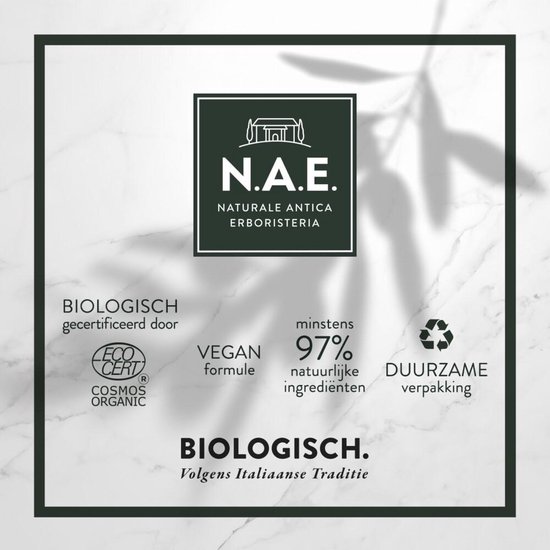 N.A.E. Vitalità douchegel bestaat voor 97% uit natuurlijke ingrediënten en voor 10% uit biologische ingrediënten. De formule is vegan en reinigt de huid in alle zachtheid, zonder deze uit te drogen. De tube bestaat uit plantaardig plastic.