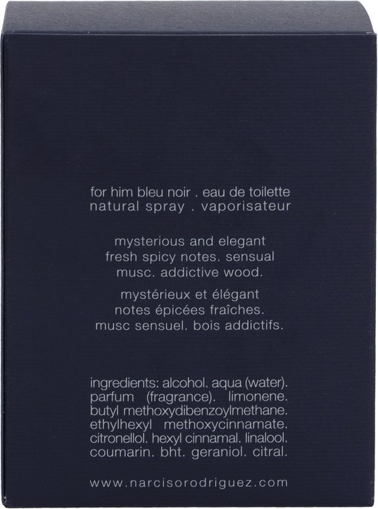 Narciso Rodriguez For Him Bleu Noir Eau de Toilette van Narciso Rodriguez is een elegante geur met een modern en verslavend geurspoor voor heren De topnoten van deze geur zijn Nootmuskaat De hartnoot is Muskus en de basisnoot is blauw