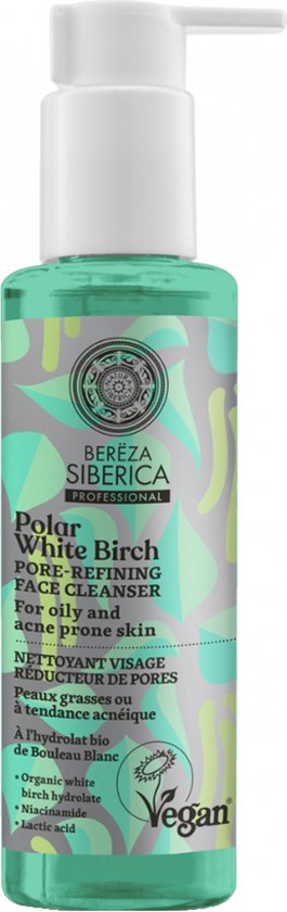 Natura Siberica Berëza Siberica Porieverminderende Gezichtsreiniger 145 ml is een gezichtsreiniger met biologische witte berken hydrolaat voor de vette of acnegevoelige huid. De formule is rijk aan betuline, dat bekend staat om zijn ontstekingsremmende, kalmerende, anti-puistjes en antioxiderende eigenschappen, om acne te helpen voorkomen zonder de huid uit te drogen.Niacinamide versterkt de vochtbarrière van de huid en reguleert de huidbalans, terwijl melkzuur mee-eters en onregelmatigheden in de huid behandelt. Deze verzachtende reinigingsgel bestrijdt onzuiverheden en overtollig talg en vermindert ontstekingen veroorzaakt door acne, om de pH-waarde van je huid weer in balans te brengen en haar schoon en gehydrateerd achter te laten. Veganistisch.