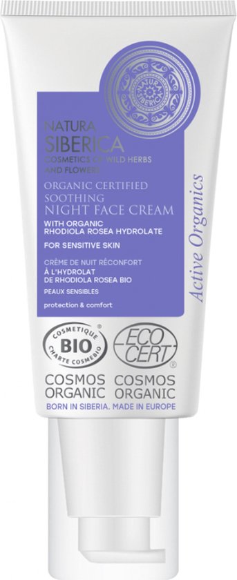 Natura Siberica Bescherming & Comfort Nachtcrème Bio 50 ml is een nachtcrème met organisch Rhodiola rosea hydrolaat. Hij is speciaal ontwikkeld voor de gevoelige huid.De formule combineert : biologisch Rhodiola rosea hydrolaat, rijk aan organische zuren, mangaan, koper, zink, essentiële oliën en flavonoïden. Het stimuleert de natuurlijke afweer van de huid, kalmeert en beschermt tegen agressieve invloeden van buitenaf,biologische Siberische pijnboomolie, een unieke natuurlijke bron van meervoudig onverzadigde zuren en vitamine E en F, voedt en verzacht de huid,hyaluronzuur, dat de huid diep voedt en hydrateert en de stevigheid en elasticiteit verbetert,vitamine E, een krachtige antioxidant, helpt huidveroudering te vertragen.De huid wordt gekalmeerd, gehydrateerd en intens gevoed. Zichtbare tekenen van vermoeidheid worden weggenomen en het regeneratieproces van de huid wordt geactiveerd. Veganistisch. 98,7% van alle ingrediënten zijn van natuurlijke oorsprong.20,7% van de totale ingrediënten zijn afkomstig van biologische landbouw. COSMOS ORGANIC gecertificeerd door Ecocert Greenlife volgens de COSMOS-norm.