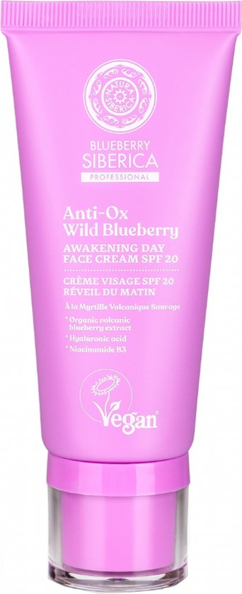 Natura Siberica Blueberry Siberica Morning Wake-up Gezichtscrème SPF20 50 ml is een crème speciaal ontwikkeld voor mensen die in grote steden wonen. De crème hydrateert de huid diep, maakt haar soepel en stralend en minimaliseert de effecten van de oxidatieve stressfactoren van het stadsleven. Wilde vulkanische bosbessen bevatten anthocyanen, die het vernieuwingsproces van de huid versnellen, de teint en elasticiteit verbeteren en de huid er weer mooi uit laten zien.Hyaluronzuur heeft een krachtig hydraterend effect op de huid.Niacinamide egaliseert de teint en laat de huid dag na dag stralen.Deze crème is ideaal voor dagelijks gebruik. Veganistisch.