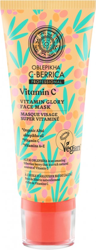 Natura Siberica C-Berrica Super Vitamin Face Mask 100 ml is een gezichtsverzorging met organisch Duindoorn hydrolaat uit Altai, van nature rijk aan vitamine C.De formule combineert : organisch oblepikha hydrolaat, dat inwerkt op de elasticiteit en hydratatie van de huid,vitamine C, die het natuurlijke afweersysteem van de huid helpt te verbeteren en het herstelproces versnelt,vitamine A en E, die de eerste tekenen van veroudering helpen te verminderen en de huid doen stralen.Dit masker, verrijkt met essentiële vitaminen, bestrijdt tekenen van vermoeidheid en maakt de huid glad, terwijl de natuurlijke teint en energie worden hersteld. Veganistisch.