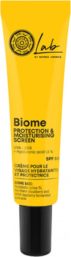 Natura Siberica Lab Biome Hydraterende en Beschermende Gezichtscrème SPF50 30 ml is een lichte, hydraterende zonnebrandcrème die de huid perfect hydrateert en tegelijkertijd een hoge bescherming biedt tegen UV-stralen.De hydratatie houdt de hele dag aan en laat de huid gezond en natuurlijk aanvoelen. De formule bevat Biome Base: unieke actieve postbiotische extracten van gefermenteerde Noordelijke Wolkenbes en Wilde Framboos die het microbioom van je huid helpen ondersteunen. Ze verhogen de weerstand van de huid tegen de effecten van een stedelijke levensstijl, verbeteren de glans en regeneratie van de huid, terwijl ze de huid gezond houden en helpen om er jong en natuurlijk uit te blijven zien.Het wordt aangevuld met : Anti-UVA-UVB filters die een “veiligheidsschild” vormen om de zonnestralen te reflecteren en hun schadelijke effecten te blokkeren.Hoog- en laagmoleculair hyaluronzuur, een krachtige vochtinbrenger die ook fijne lijntjes en rimpels helpt voorkomen.