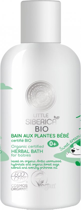Natura Siberica Little Siberica Biologisch Babybad 250 ml is een oplossing om toe te voegen aan het badwater, op basis van biologisch arctisch bijvoet hydrolaat, biologisch extract van wilde salie en teunisbloemolie.Het heeft een kalmerend en verzachtend effect op de babyhuid en bevat essentiële oliën om de baby te helpen goed te slapen. Geschikt vanaf de geboorte. Hydrolat is een geconcentreerde cocktail van vitaminen en micro-elementen verkregen door distillatie van planten. Babyverzorgingsproducten op basis van Hydrolat reinigen de babyhuid op milde wijze en maken haar zacht en zijdeachtig. Veganistisch. 98,7% van de ingrediënten is van natuurlijke oorsprong.98,4% van de ingrediënten zijn afkomstig van biologische landbouw. COSMOS ORGANIC gecertificeerd door ECOCERT Greenlife volgens de COSMOS-norm.
