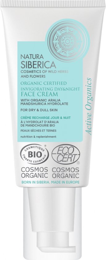 Natura Siberica Nutrition & Density Organic Dag & Nacht Replenishing Cream 50 ml is een crème met organisch Manchurian Aralia hydrolaat. Hij is speciaal ontwikkeld voor de droge, doffe huid.De formule combineert : organisch Manchurian Aralia hydrolaat, van een unieke adaptogene plant, zit boordevol vitamine B en C en flavonoïden. Het beschermt de huid tegen agressieve invloeden van buitenaf, voedt en verstevigt de droge huid,biologische Siberische pijnboomolie, een unieke natuurlijke bron van meervoudig onverzadigde zuren en vitamine E en F, voedt en verzacht de huid,hyaluronzuur voedt en hydrateert de huid diep en verbetert de stevigheid en elasticiteit,vitamine E, een krachtige antioxidant die huidveroudering helpt te vertragen.De huid is diepgaand gehydrateerd. Ze is gevoed en getonifieerd en voelt zacht en fluweelzacht aan. Veganistisch. 98,7% van alle ingrediënten zijn van natuurlijke oorsprong.20,7% van de totale ingrediënten zijn afkomstig van biologische landbouw. COSMOS ORGANIC gecertificeerd door Ecocert Greenlife volgens de COSMOS-norm.