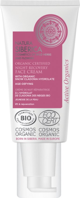 Natura Siberica Skin Youth Organic Herstellende Nachtcrème 50 ml is een nachtcrème met organisch sneeuwcladonia hydrolaat die de elasticiteit van de huid verbetert en het natuurlijke regeneratieproces activeert.De formule combineert : bio cladonia des neiges hydrosol, gemaakt van in het wild geplukte cladonia des neiges, is zeer geconcentreerd in usnic zuur. Het heeft een verstevigende werking en helpt fijne lijntjes voorkomen,biologische Siberische pijnboomolie, een unieke natuurlijke bron van meervoudig onverzadigde zuren en vitamine E en F, die de huid voedt en verzacht,hyaluronzuur, dat de huid diep voedt en hydrateert en de stevigheid en elasticiteit verbetert,vitamine E, een krachtige antioxidant die huidveroudering helpt te vertragen.Het ovaal van het gezicht wordt verfijnd en rimpels worden verminderd. Veganistisch. 98,7% van alle ingrediënten zijn van natuurlijke oorsprong.20,2% van de totale ingrediënten zijn afkomstig van biologische landbouw. COSMOS ORGANIC gecertificeerd door Ecocert Greenlife volgens de COSMOS-norm.