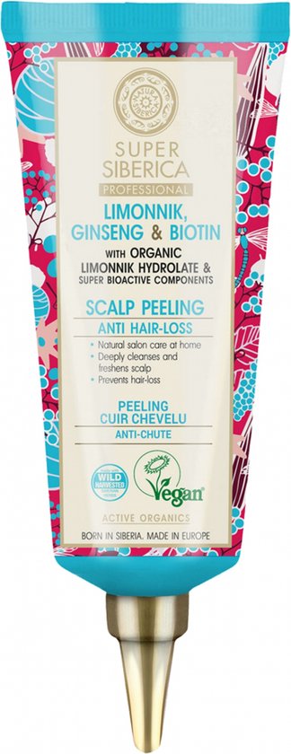 Natura Siberica Super Siberica Anti-haaruitval Hoofdhuid Peeling 100 ml is een peeling ontwikkeld om haaruitval van alle soorten tegen te gaan. De formule combineert organisch schissandra hydrolaat, organische ginseng- en sagan dailja-extracten, glycolzuur, biotine, taurine, vitamine B6, B12 en PP.Het reinigt de hoofdhuid diep, bevordert de penetratie van vitamines en actieve ingrediënten tegen haaruitval en geeft volume.Het gebruik ervan verbetert de effectiviteit van andere behandelingen en de haargroei. Veganistisch.