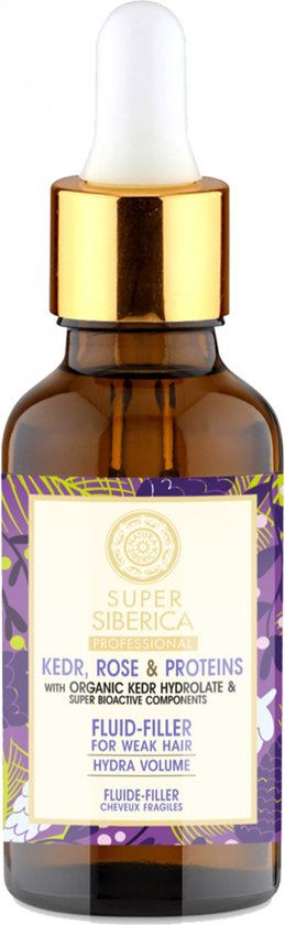 Natura Siberica Super Siberica Hydra Volume Fluid-Filler Voor Breekbaar Haar 50 ml is een verzorging die is ontwikkeld om breekbaar haar te hydrateren en volume te geven. De formule combineert organisch Siberisch dennen hydrolaat, organische extracten van Dahuriaanse roos, jeneverbes en rhodiola rosea, gehydrolyseerde proteïnen, provitamine B5 en hyaluronzuur.Het helpt om kwetsbaar haar effectief te versterken en te hydrateren, waardoor het zijdezacht en glad wordt. De vloeistof omhult de gehele lengte van de haarvezel en vult beschadigde gebieden op om glad, zijdezacht haar met volume en glans te herstellen. Veganistisch.