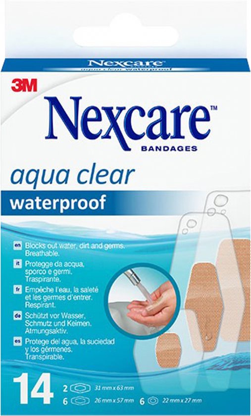 Nexcare™ Aqua Clear Waterproof pleisters houden water, vuil en bacteriën tegen en zijn bij uitstek geschikt voor zwemmen, tuinieren, kanoën, vissen, watersporten en handwasjes. Nexcare™ Aqua Clear Waterproof pleisters hebben een unieke diamantvorm, bieden 360° bescherming, zijn gemaakt van transparant materiaal dat de huid laat ademen en bieden optimale bescherming tegen water, vuil en bacteriën die infecties kunnen veroorzaken. Nexcare™ Aqua Clear Waterbestendige pleisters zijn onmisbaar in iedere EHBO-set en zijn ideaal om oppervlakkige verwondingen zoals snij- en schaafwonden te behandelen.