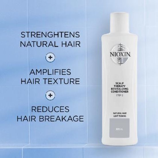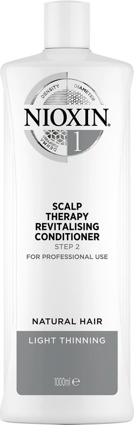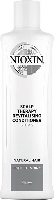 Nioxin System 1 Step 2 Scalp Therapy Revitalizing Conditioner Deze conditioner is bedoeld voor normaal tot dun uitziend haar De hoofdhuid wordt verfrist de hoofdhuid en voorziet het haar van een mooie natuurlijke glans De conditioner helpt de weerstand en het vochtbalans op peil te houden Vrij van SLS sulfaten en parfum Gebruik Was het haar eerst met shampoo breng de conditioner aan op handdoekdroog haar Verdeel de conditioner en laat deze 1 tot 3 minuten inwerken en spoel deze grondig uit