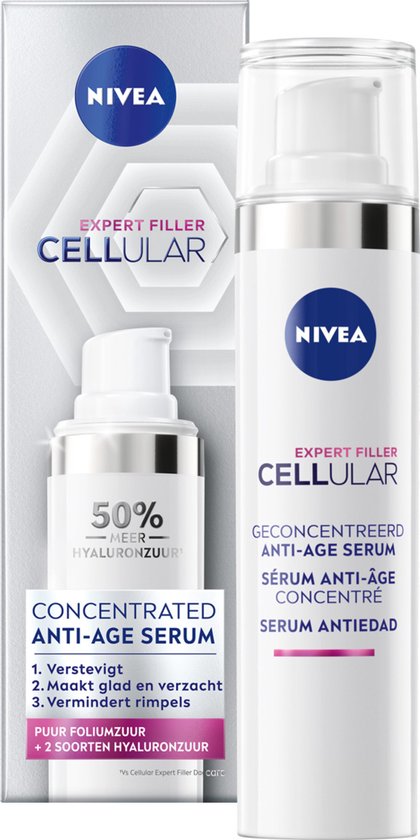 <p>Geniet van de krachtige voeding van het NIVEA CELLular Expert Filler Anti-Age Serum. Dit serum is speciaal ontwikkeld voor de ouder wordende huid, met sterk geconcentreerde ingrediënten die de huid effectief binnendringen. Gebruik het serum voor je gezicht dagelijks nadat je je huid gereinigd hebt. De bestanddelen vullen je rimpels op natuurlijke wijze op en zorgen voor een bewezen verbetering van de huidstevigheid. Je huid voelt gladder en zachter aan, en fijne lijntjes zijn minder zichtbaar. Dat maakt dit NIVEA CELLular Filler serum een perfecte toevoeging aan je anti-age gezichtsverzorging.</p> <ul> <li>Rimpels worden zichtbaar verminderd en opgevuld dankzij het opvullende effect, dat al binnen 24 uur merkbaar is*</li> <li>Bewezen verbetering van de huidstevigheid</li> <li>Laat je huid gladder en zachter aanvoelen</li> <li>Speciaal ontwikkeld voor de ouder wordende huid</li> <li>Met hyaluronzuur en collageenboost voor een intensief anti-age effect</li> </ul> <p>Twee ingrediënten zorgen samen voor de verstevigende werking van dit serum voor je gezicht. Het bestanddeel puur foliumzuur is effectief op het niveau van de huidcellen en draagt bij aan het versterken van de ondersteunende vezels* voor een stevigere en meer volumineuze huid Geef je je huid dagelijks een boost collageen met dit serum? Dan voel je dat deze veerkrachtiger aanvoelt en bovendien gladder oogt. Met 50% extra Hyaluronzuur biedt het een krachtig anti-aging effect. Hyaluronzuur is ook juist uitstekend in het vasthouden van vocht. Zo geniet je huid van diepe hydratatie en weet je zeker dat de vochtbalans op peil blijft. Het NIVEA Cellular Expert Filler Anti-Age Serum zorgt voor een merkbare hydratatie van de huid, verbetert de teint aanzienlijk, en verhoogt de stevigheid en elasticiteit van de huid. Hierdoor wordt de huid uniformer en worden rimpels aanzienlijk minder zichtbaar. De huidtolerantie is dermatologisch bevestigd. *in vitro getest.</p>
