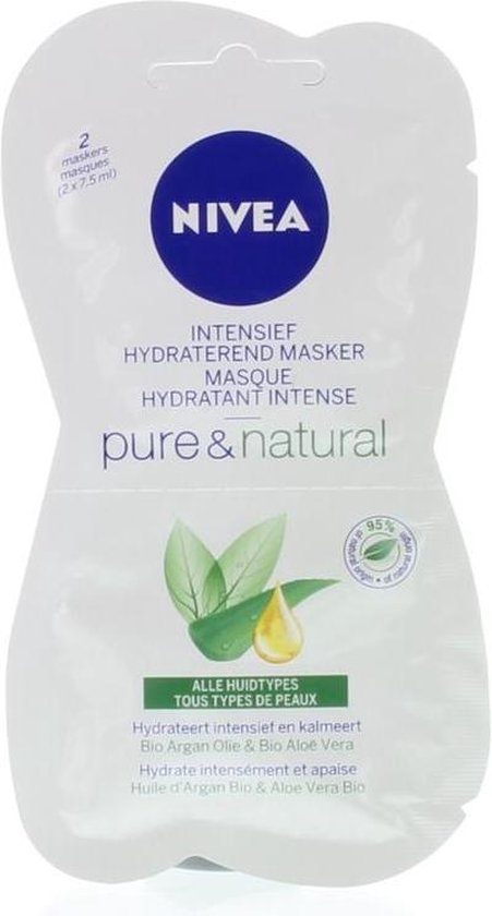 NIVEA Pure & Natural Intensief Hydraterend Masker met biologische Argan Olie en Aloe Vera verwent de huid met intensieve hydratatie en kalmerende bestanddelen, zodat de huid haar natuurlijke balans behoudt.