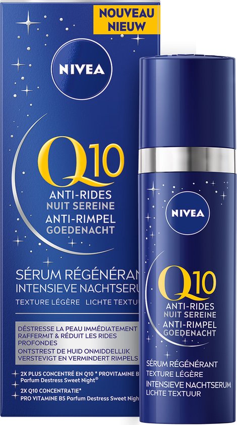 <p>NIVEA Q10 Anti-Rimpel Nachtserum 30ml revitaliseert je huid in de nacht. Help je huid om tot rust te komen en haal het meeste uit een goede nachtrust met deze gespecialiseerde gezichtsverzorging, ontwikkeld voor de gevoelige huid. Dit anti-rimpel serum ondersteunt het herstel- en regeneratieproces van de huid terwijl jij ligt te slapen. Door de lichte textuur van deze gezichtsverzorging merk je bijna niet dat het er zit, wat zorgt voor een comfortabele nachtrust.</p> <ul> <li>Zichtbaar huidherstel tijdens de nacht</li> <li>Neutraliseert schade die zich gedurende de dag voordoet</li> <li>Intense hydratatie na 1 nacht***</li> <li>Minder zichtbare rimpels na 14 nachten***</li> <li>Verdere vermindering van rimpels na 28 nachten***</li> </ul> <p>De formule van het nachtserum bevat een dubbele concentratie* co-enzym Q10, van natuurlijke oorsprong, en provitamine B5. Q10 geeft de huid nieuwe energie om het natuurlijke herstelproces te maximaliseren tijdens de nacht**. Dit natuurlijke stofje beschermt je huidcellen tegen beschadiging en vertraagt het verouderingsproces. Provitamine B5 bevordert het eigen regeneratieproces van de huid om de schade die zich gedurende de dag heeft voorgedaan te helpen neutraliseren**. Dat maakt dit NIVEA Q10 nachtserum de ideale persoonlijke verzorging voor de nacht. Het anti-rimpel nachtserum is huidvriendelijk en dermatologisch goedgekeurd.</p> <p>*instrumentele evaluatie, 42 vrouwen, 4 weken.</p> <p>**in vergelijking met het Nivea Q10 gamma.</p> <p>***in vitro.</p>