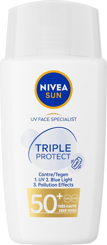 <p>Bescherm de kwetsbare huid van je gezicht met NIVEA SUN UV Face Specialist Triple Protect Fluid. Deze zonnecrème is speciaal ontwikkeld voor je gelaat en biedt 3-in-1 bescherming. Zo voorkom je niet alleen schade door UVA/UVB-stralen, maar ook door blauw licht en een vervuilde lucht. Op deze manier ga je vroegtijdige huidveroudering tegen en voorkom je oxidatieve stress. Dat zorgt voor een stralende huid, die van bescherming met SPF 50 geniet. De niet-vette formule trekt snel in de huid en voelt heerlijk zacht aan.</p> <ul> <li>Speciaal ontwikkeld voor het gezicht</li> <li>3-in-1 bescherming tegen uv-stralen, blauw licht en vervuiling</li> <li>Met SPF 50</li> <li>Verrijkt met zoethoutextract, hyaluronzuur en antioxidanten</li> <li>Geschikt voor alle huidtypen</li> </ul> <p>Deze zonnebrand voor het gezicht beschermt de huid ook van binnenuit dankzij zoethoutextract. Deze natuurlijke antioxidant activeert het huideigen afweermechanisme om de cellen te beschermen en voorkomt zo schade door de zon of vervuiling. Tegelijkertijd geniet je van de werking van hyaluronzuur. Dit is een natuurlijke vochtinbrenger die de huid zacht, voller en egaal aan laat voelen. Je gebruikt NIVEA SUN UV Face Specialist Triple Protect Fluid met een gerust gevoel, want de formule bestaat voor 76% uit biologisch afbreekbare ingrediënten. Tegelijkertijd bevat de zonnecrème geen uv-filters, octinoxate, oxybenzone en octocrylene. Zo respecteert NIVEA de oceaan. De huidverdraagzaamheid is dermatologisch goedgekeurd.</p>