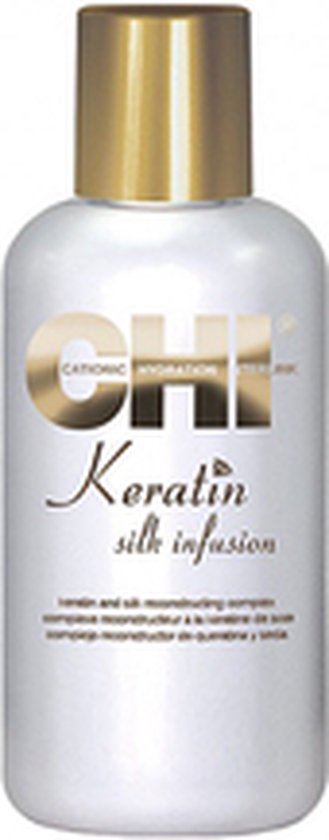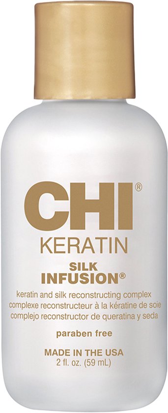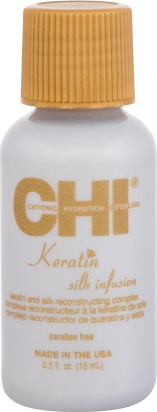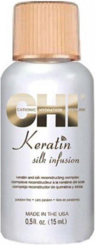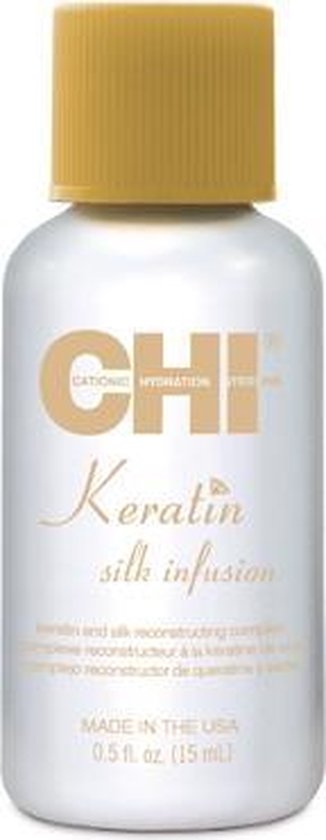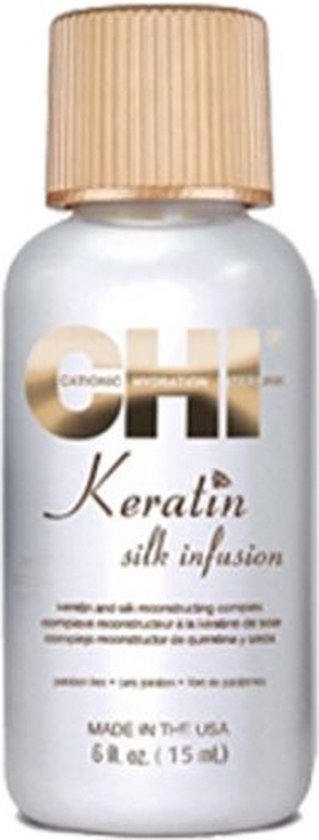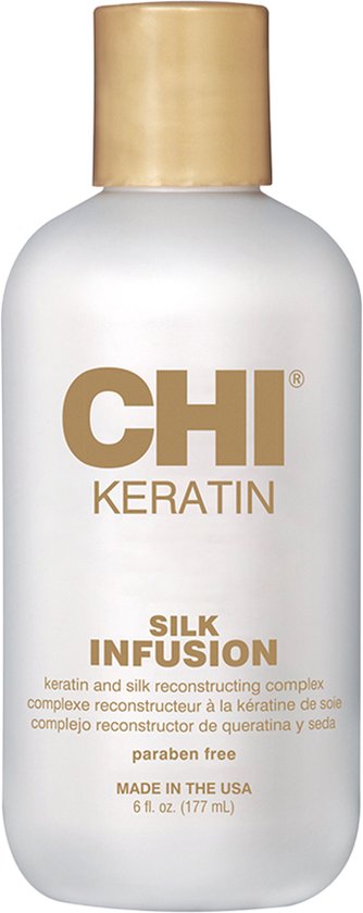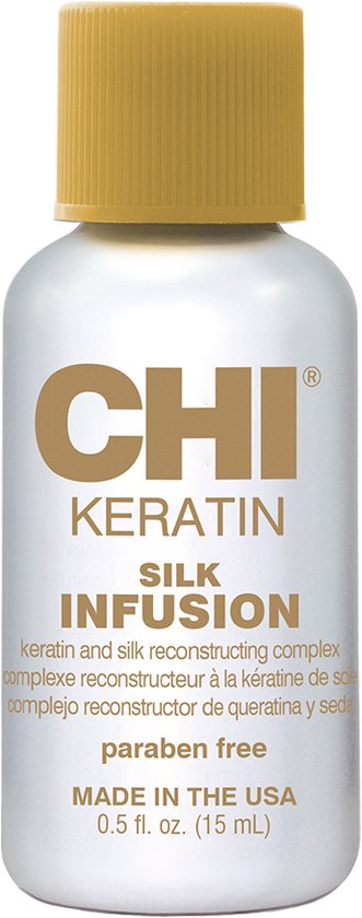 CHI Keratin Silk Infusion CHI Keratine Silk Infusion is een krachtige reconstruerend complex dat herstelt en droog beschadigd haar hydrateert Terwijl de natuurlijke Keratine de cuticula van het haar herbouwt dringt zijde diep door in het haar om vocht vast te houden en de haarschacht glad te maken Deze unieke verbinding verbetert drastisch de elasticiteit voorkomt toekomstige breuk terwijl het intense hydratatie toevoegt die de zachtheid en de glans van het haar herstelt Gebruik Breng een kleine hoeveelheid aan op de palm van uw hand Masseer het gelijkmatig door het haar Laat het product in het haar en ga verder met stylen