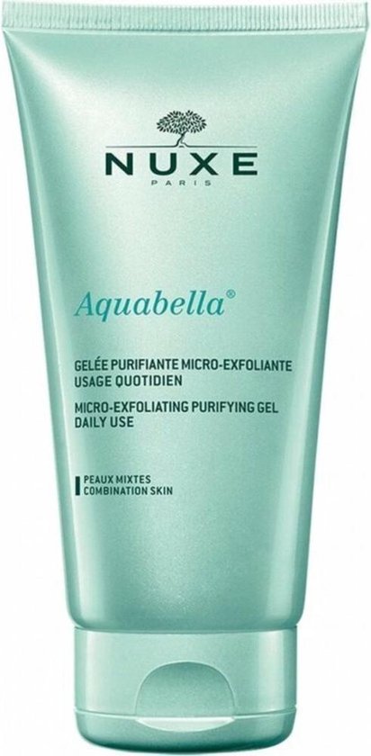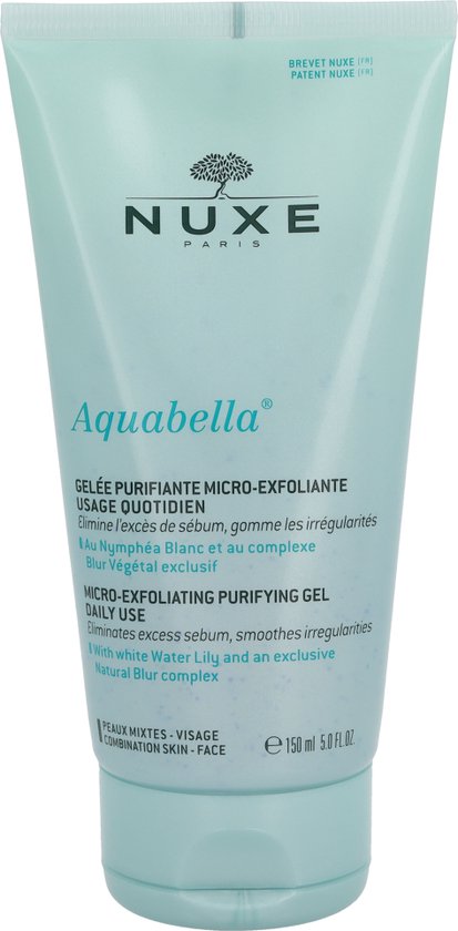 Nuxe Aquabella Gelee Purifiante Micro Exfoliante Een gezichtsreiniger voor dagelijks gebruik op de gemengde huid Verwijdert overtollig talg strijkt onzuiverheden glad en zorgt voor ultieme frisheid Gebruik Breng s morgens of s avonds de gel aan op de vochtige huid maar vermijd de oogcontouren Spoel dan af Bij contact met de ogen overvloedig spoelen